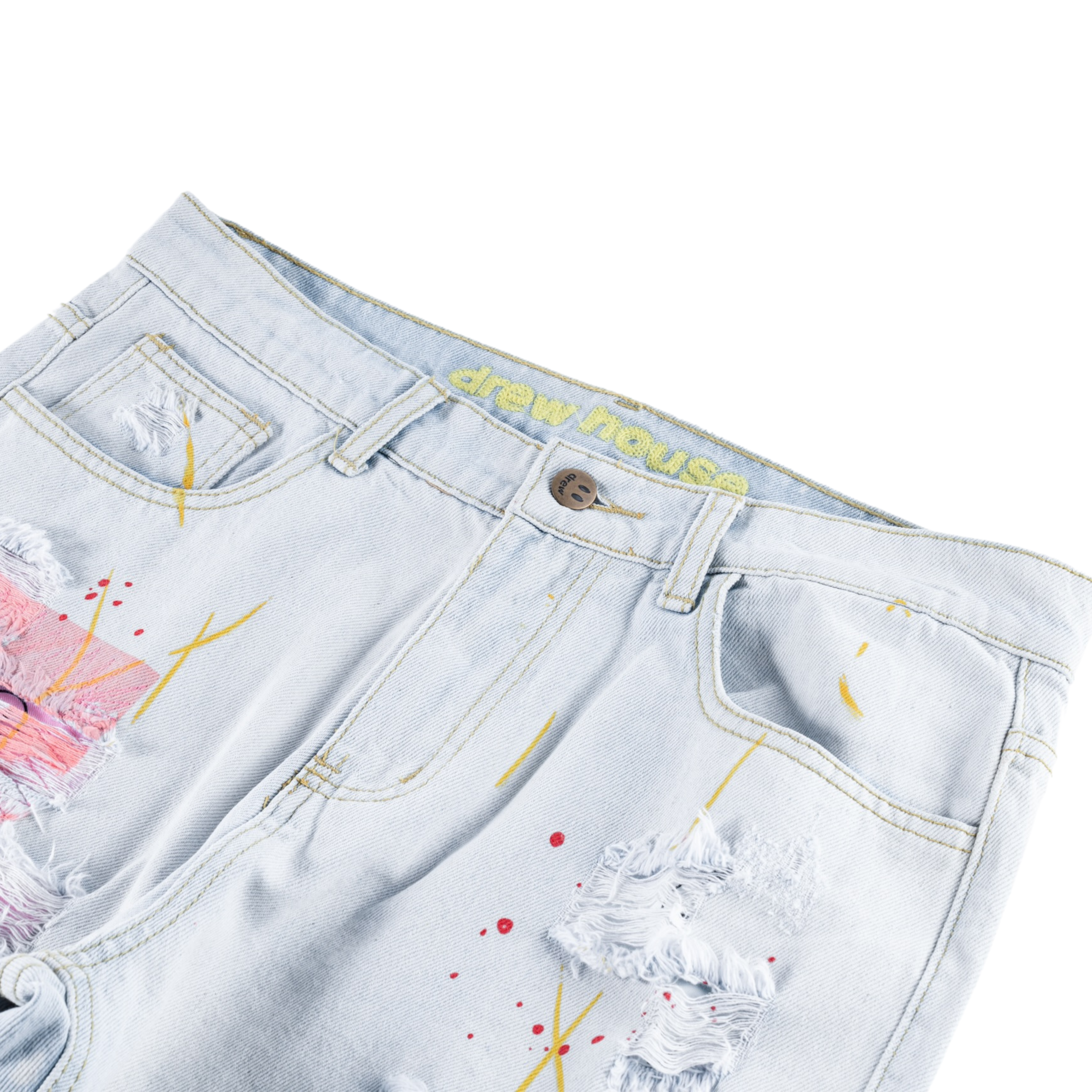 - Design:Â Ripped and distressed denim with a prominent hole revealing an artistic bear graphic.