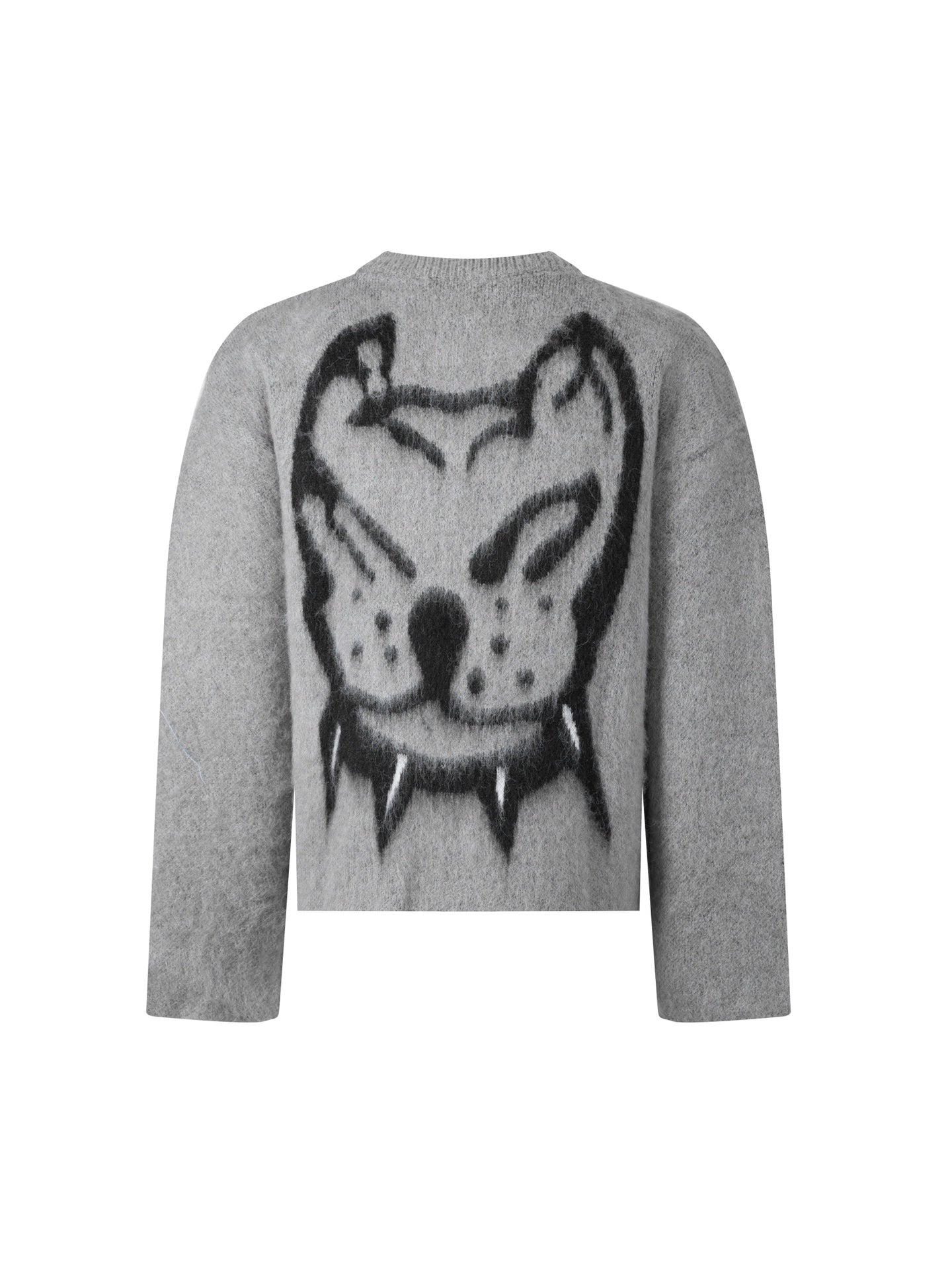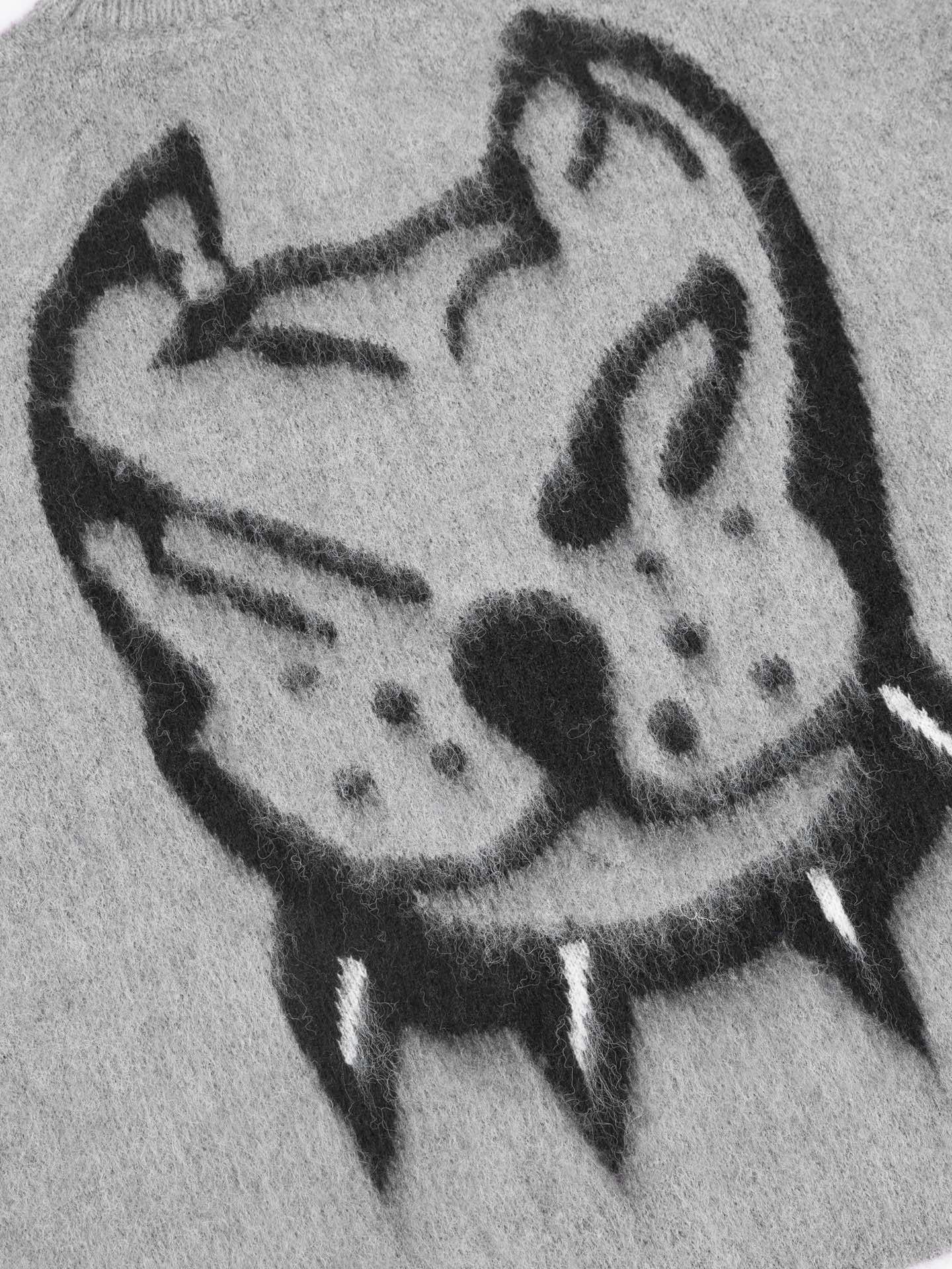 - Features an eye-catching intarsia knit depicting a stylized dog head, adding a unique and rebellious touch.